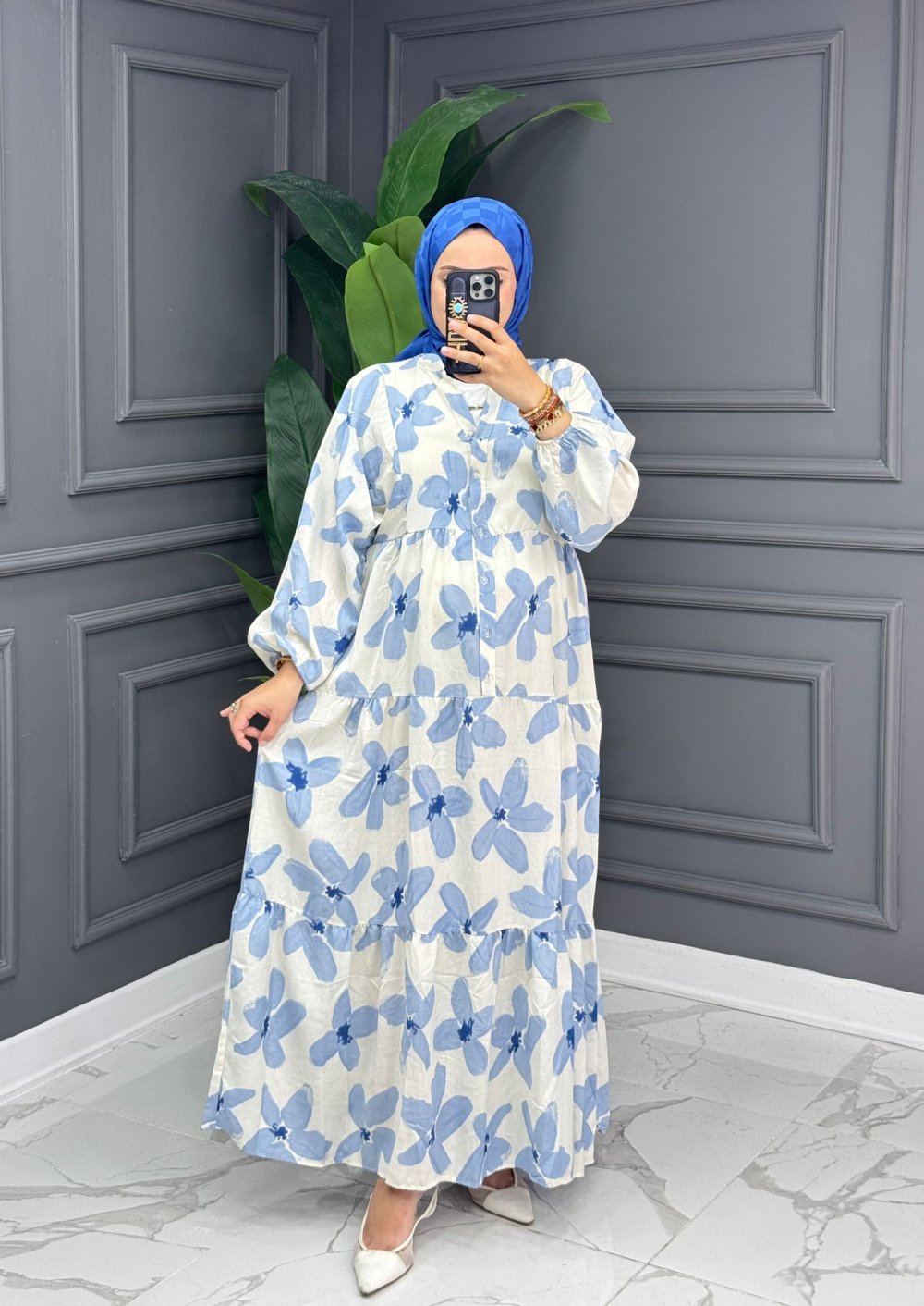 Ahel Çiçekli Elbise - Mavi