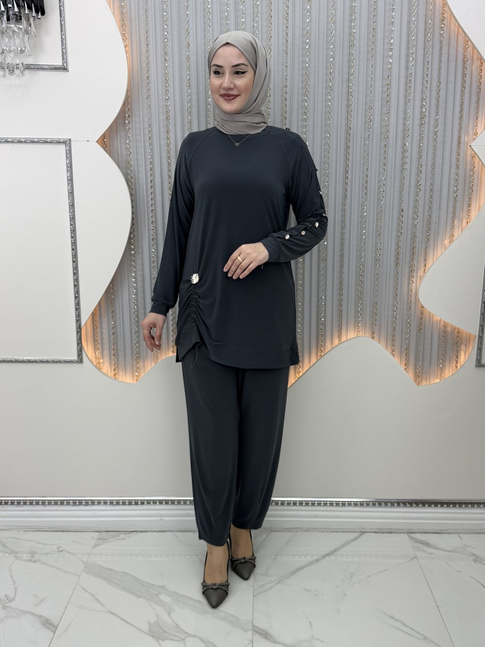Büzgü pantolonlu takım Antrasit