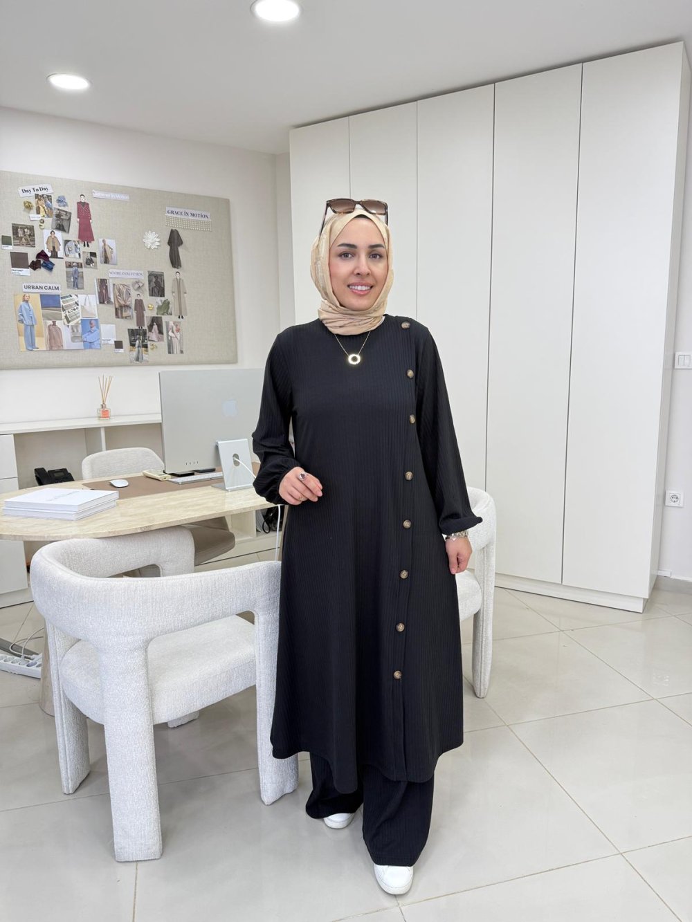 Tunik boy 120 cm’dir. Sol tarafında çubuk düğme detayı, bileklerinde lastik bulunmaktadır.