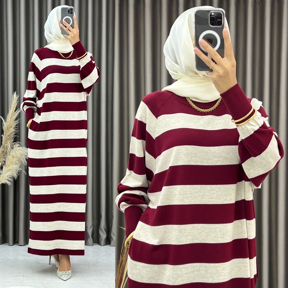 Elya Çizgili Elbise Bordo