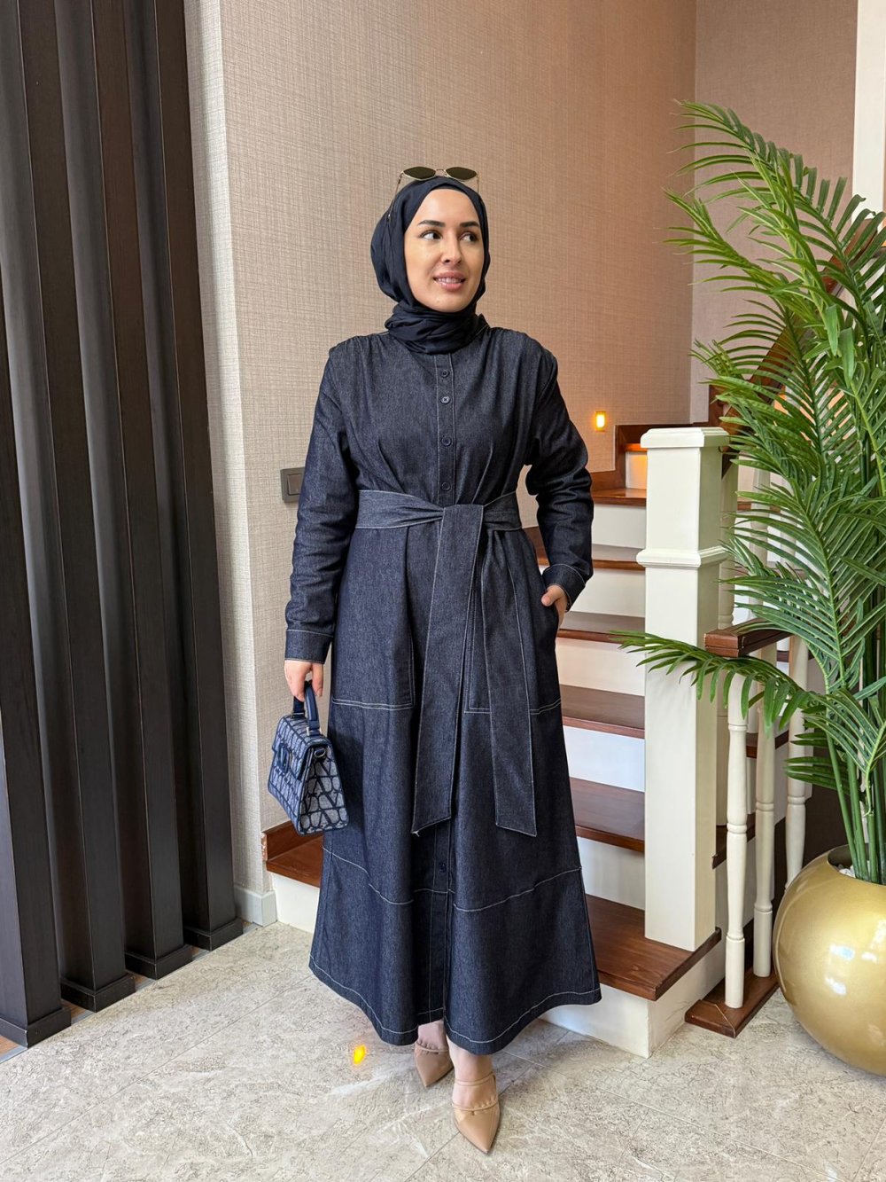 * Kontrast Dikişli Kot Elbise •