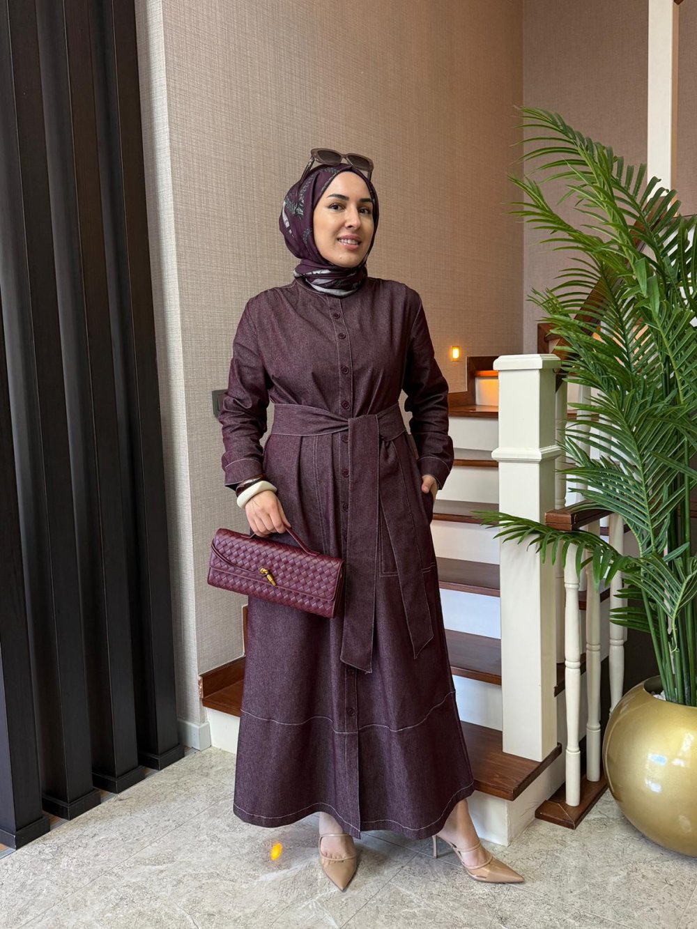 Kontrast Dikişli Kot Elbise Mürdüm