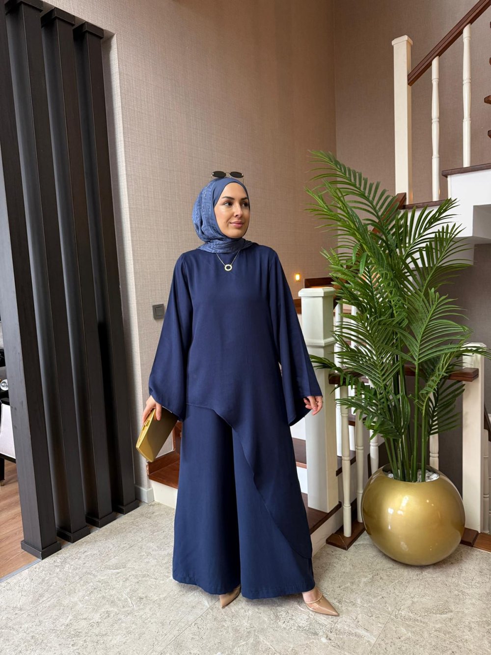 Pantolon boy 105 cm’dir. Önü kemerli, arkası lastiklidir. Pantolon etek formundadır.