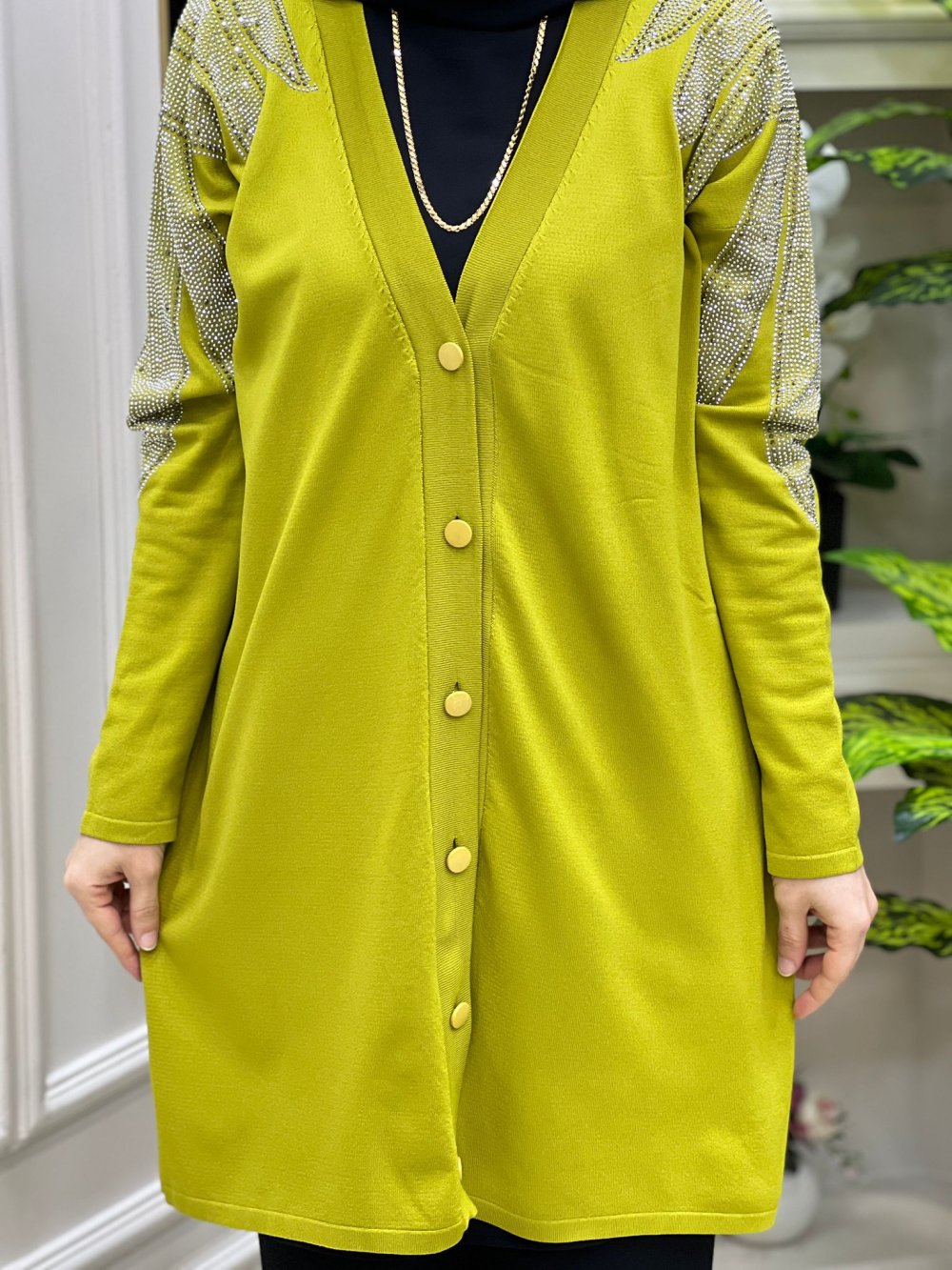 Yeni Sezon Müjgan Soğuk İplik Triko Hırka Ürün kodu Müjgan : 13136 Fiyat boy : 90 cm beden 38/46 uyumlu standart Kumaşımız 1.sınıf Soğuk iplik Triko düğmeli kol taş baskili
