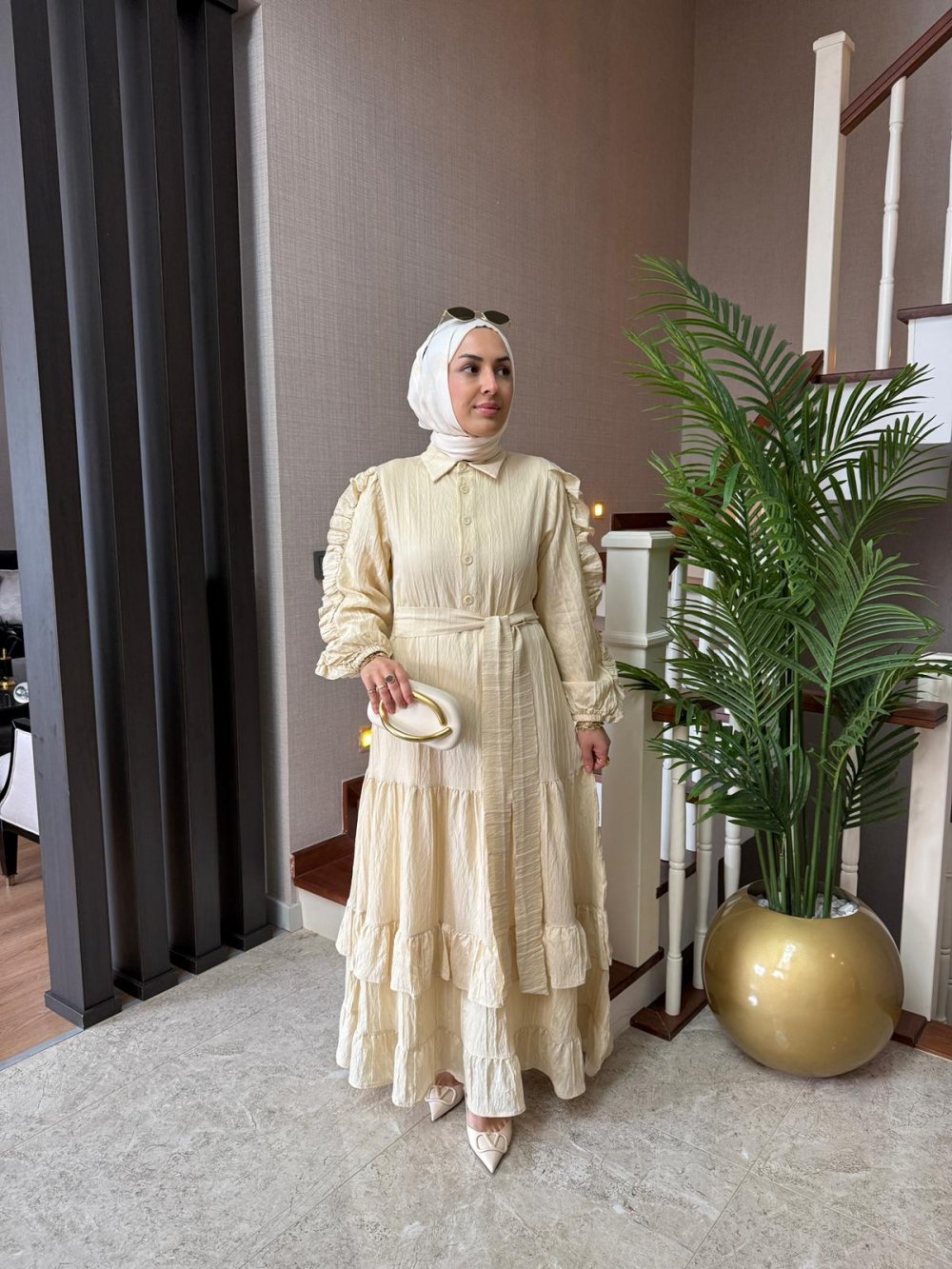 Seyyar kuşağı mevcuttur. Kollarında fırfır, etek uçlarında kat kat detayları bulunmaktadır. Kol uçları lastiklidir.
